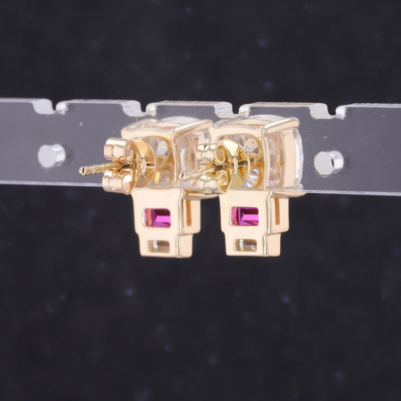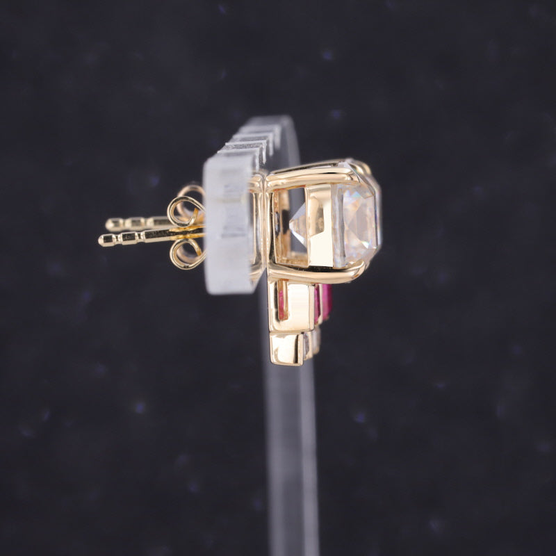These exquisite Stud earrings feature lab grown rubies and moissanite diamonds set in 9K solid gold. The cushion cut diamonds perfectly complement the rich red hue of the rubies, creating a stunning and elegant piece of jewelry.