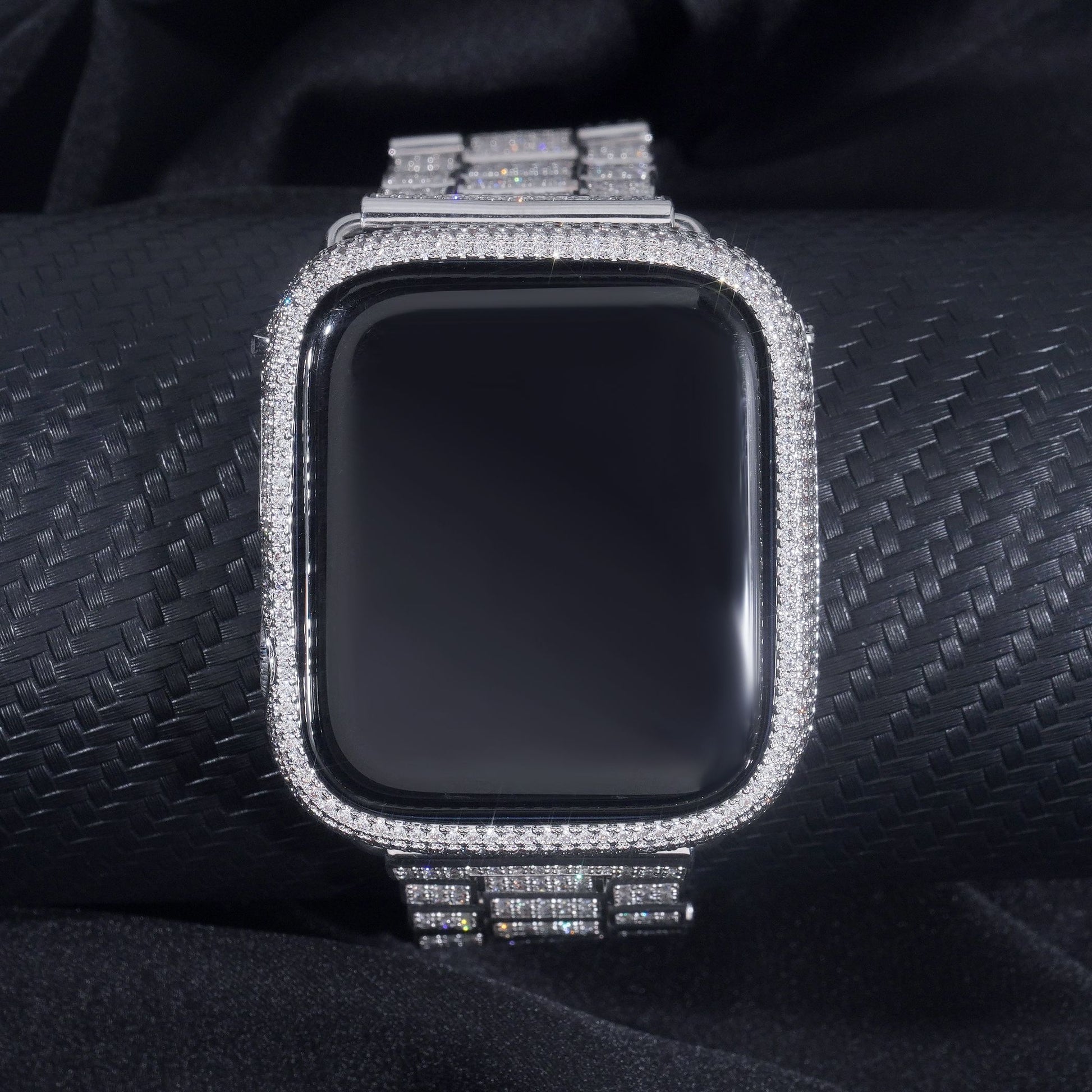 Elevate your Apple Watch with our Moissanite Bezel or Case in sterling silver. Available for all watch sizes from 38mm to 49mm, this exquisite accessory is crafted from high-quality Sterling Silver. The bezel is adorned with brilliant Moissanite Diamonds, adding a touch of glamour to your smartwatch. The Anti-Tarnish White Gold Plating ensures lasting radiance, combining technology with timeless elegance. Upgrade your Apple Watch with the Moissanite Bezel or Cover and make a statement of sophistication on your wrist. ⌚💎