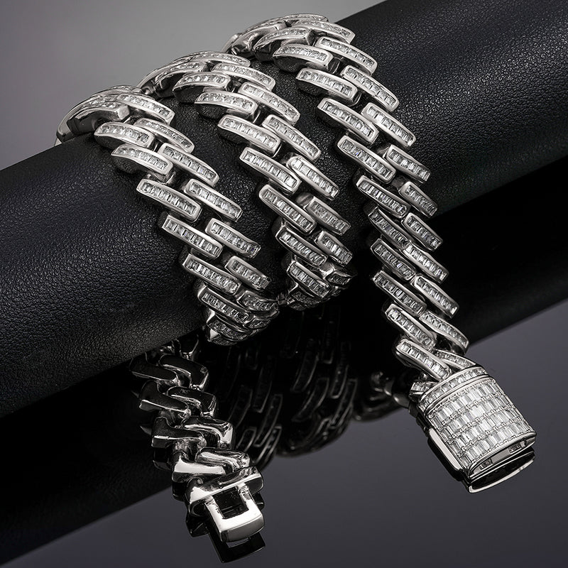 MOISSANITE BAGUETTE CUBAN LINK BRACELET/NECKLACE IN STERLING SILVER: Crafted in premium sterling silver, this Cuban link piece features sleek baguette-cut stones precisely set into each link for a sharp, high-impact shine. The structured design delivers a refined yet powerful look, blending modern luxury with street-edge appeal. Finished with a secure box clasp for a confident fit, it’s designed to be worn as a statement bracelet or necklace. Bold, polished, and unmistakably luxe ✨🧊