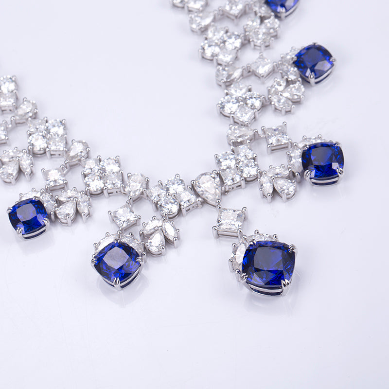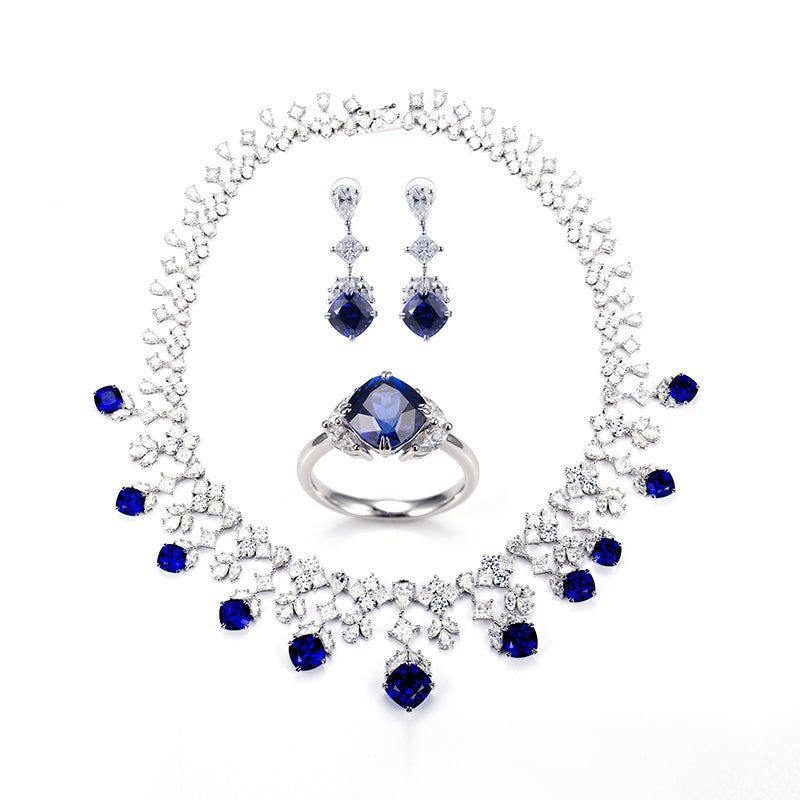 Elevate your wedding or engagement ensemble with our exquisite Moissanite Diamond and Lab-Grown Sapphire Chain Necklace, Ring, and Earrings Jewelry Set in sterling silver. This captivating set features shimmering Moissanite diamonds paired with rich lab-grown sapphires, each expertly crafted into a luxurious cushion-cut design. With its timeless elegance and sophisticated charm, this jewelry set adds a touch of glamour to any special occasion. Make a statement of everlasting love and elegance with this enchanting set, designed to capture hearts and turn heads.