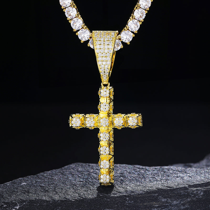 The Moissanite Diamond Cross Pendant Necklace in Sterling Silver with Rope Chain is a stunning piece that blends timeless elegance with modern design. Featuring a cross adorned with brilliant moissanite diamonds, this necklace sparkles with exceptional brilliance. The pendant is crafted from high-quality sterling silver and hangs gracefully from a durable rope chain, adding a touch of sophistication to any ensemble. Perfect for both everyday wear and special occasions, this necklace is a versatile and stylish addition to any jewelry collection.