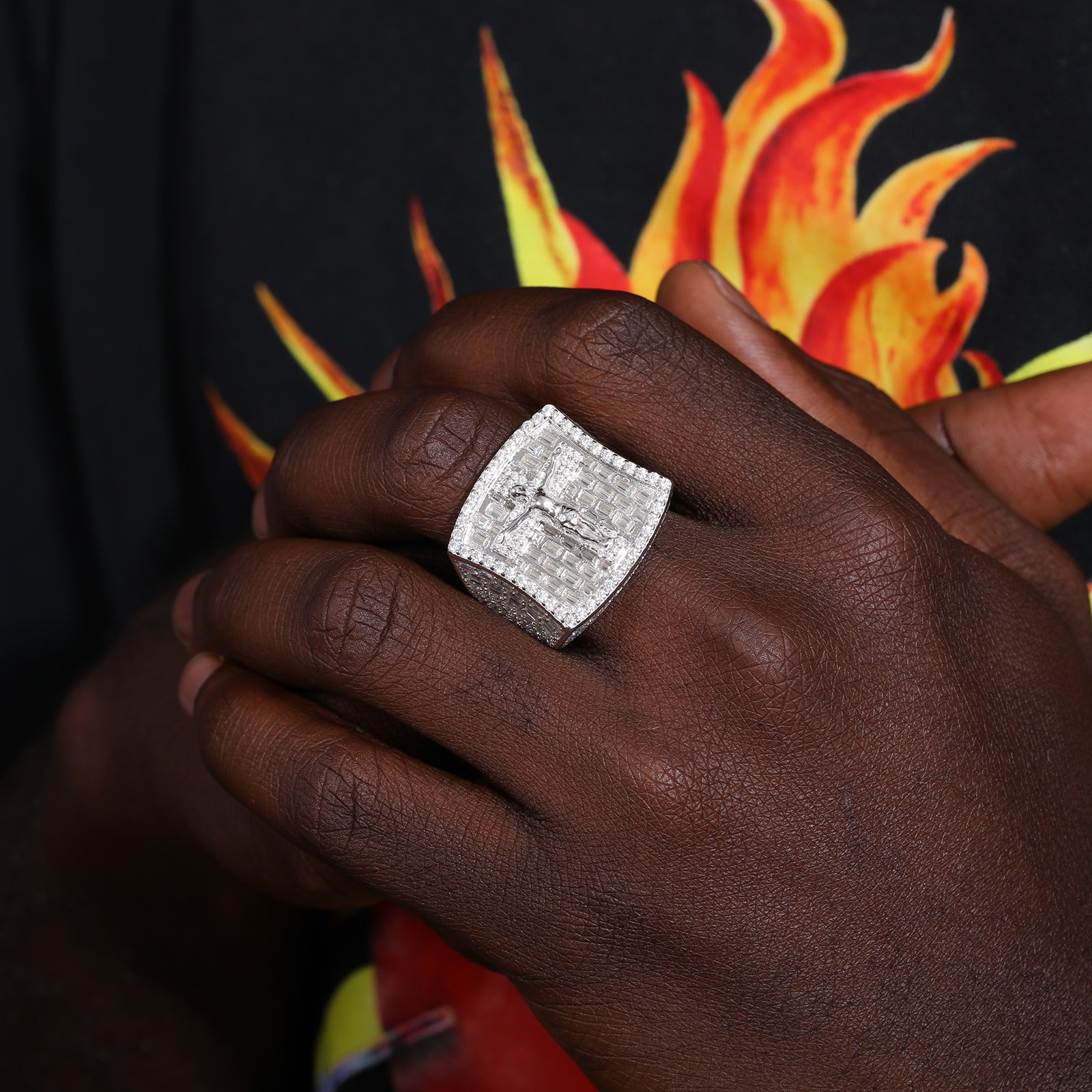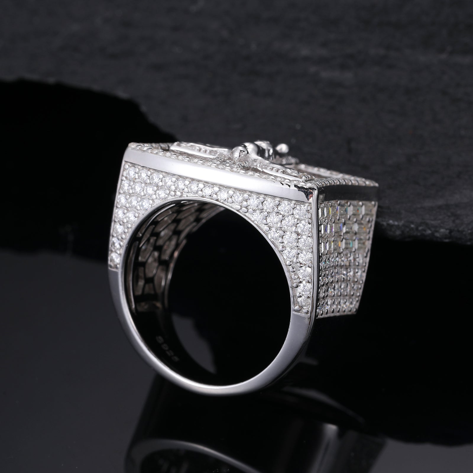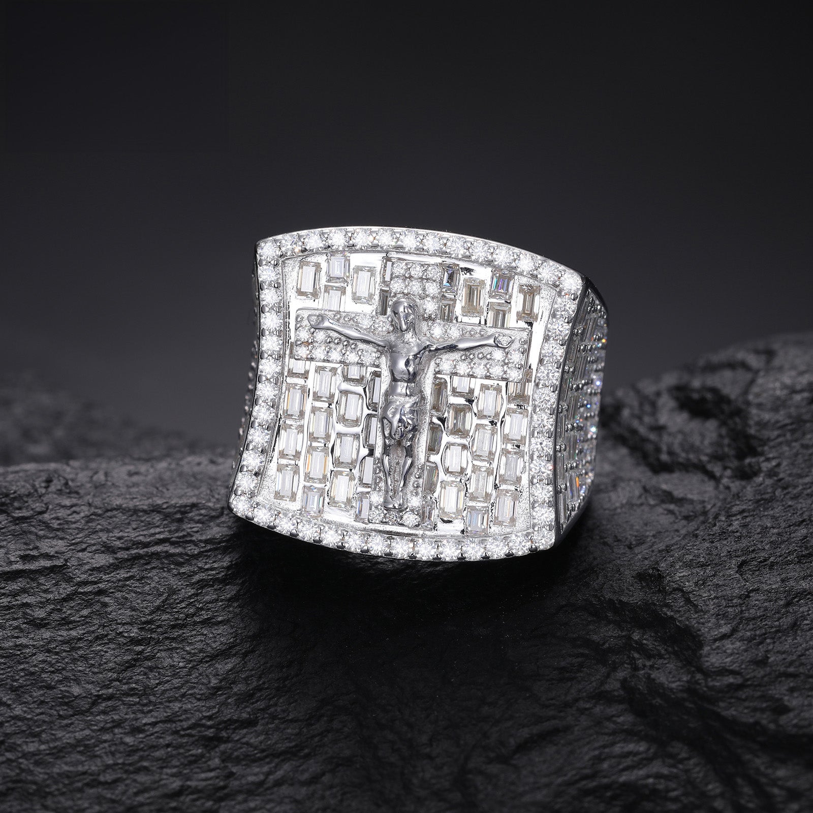 MOISSANITE DIAMOND CRUCIFIXION JESUS STAMP RING IN STERLING SILVER