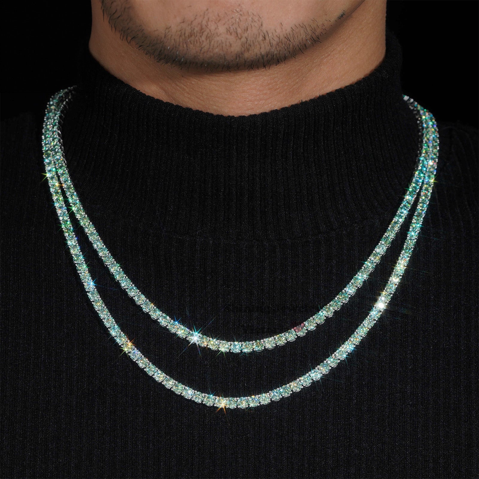 The Moissanite Diamond Green Cluster Tennis Chain in Sterling Silver is a breathtaking piece of jewelry that combines elegance and vibrant color. Featuring dazzling green moissanite diamonds set in a classic tennis chain design, this necklace radiates brilliance and sophistication. Crafted from high-quality sterling silver, it ensures durability and a lasting shine. Perfect for adding a pop of color and sparkle to any outfit, this tennis chain is a stunning accessory for any occasion.