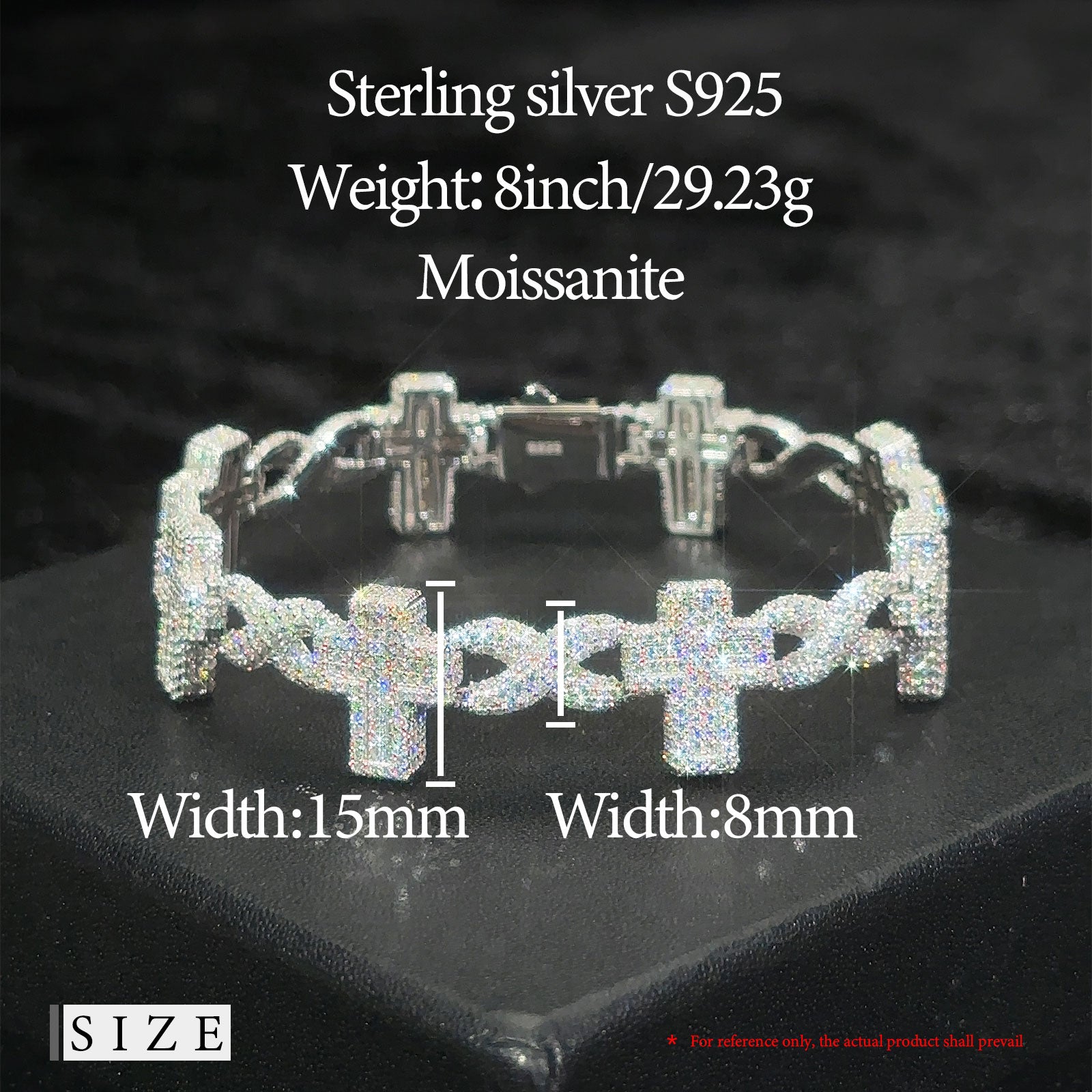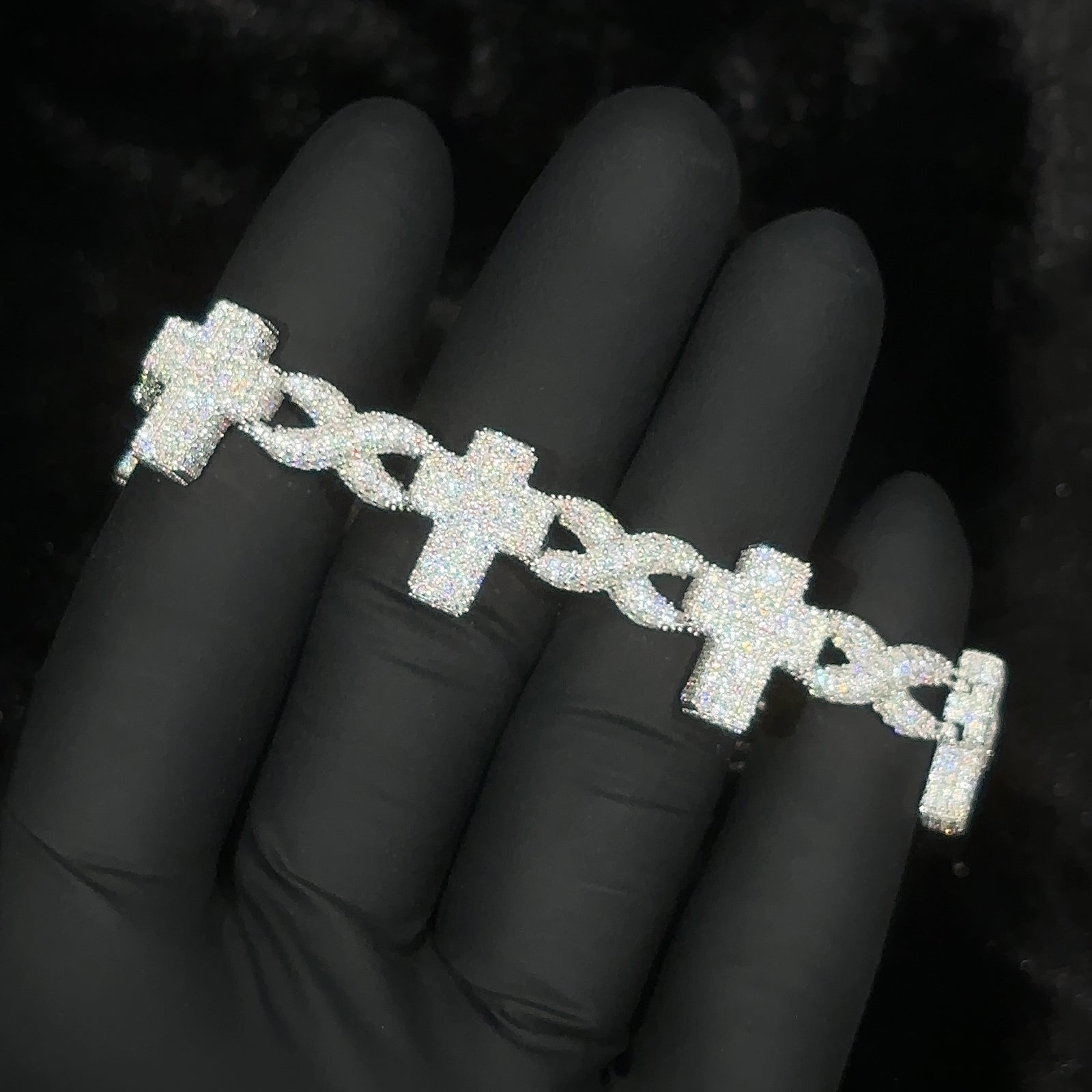 Enhance your jewelry collection with the Moissanite Diamond Infinity Cross Bracelet in Sterling Silver. Featuring multiple intricately designed crosses and infinity symbols, this bracelet is a stunning blend of faith and eternal elegance. Each cross, measuring 15mm in width, is adorned with shimmering moissanite diamonds, while the infinity symbols, 8mm in width, add a touch of timeless sophistication. Crafted from high-quality sterling silver, this bracelet is perfect for any occasion, adding a radiant sparkle to any ensemble.