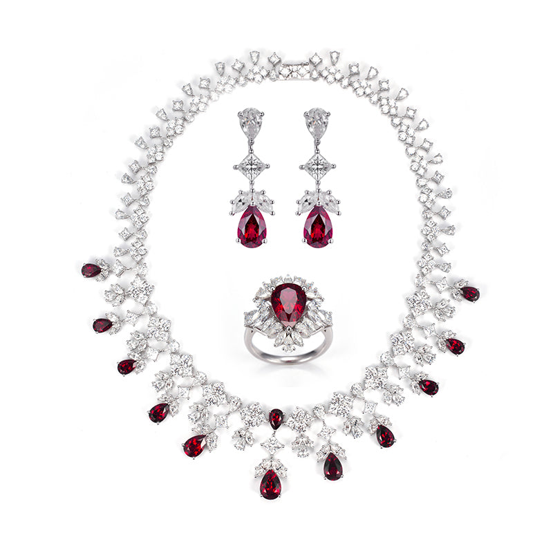 MOISSANITE AND LAB GROWN RUBY NECKLACE RING EARRINGS JEWELRY SET IN STERLING SILVER