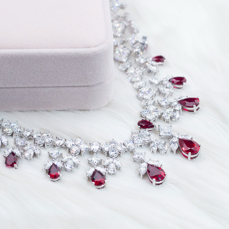 Elevate your elegance with our Moissanite Diamond and Lab-Grown Ruby Chain Necklace, Ring, and Earrings Jewelry Set in Sterling Silver. Adorned with vibrant lab-grown rubies and shimmering Moissanite diamonds, this set exudes sophistication and charm. Perfect for engagements and weddings, each piece is meticulously crafted for timeless beauty. Embrace the luxury and celebrate your special moments with this exquisite set, designed to captivate hearts and inspire admiration.