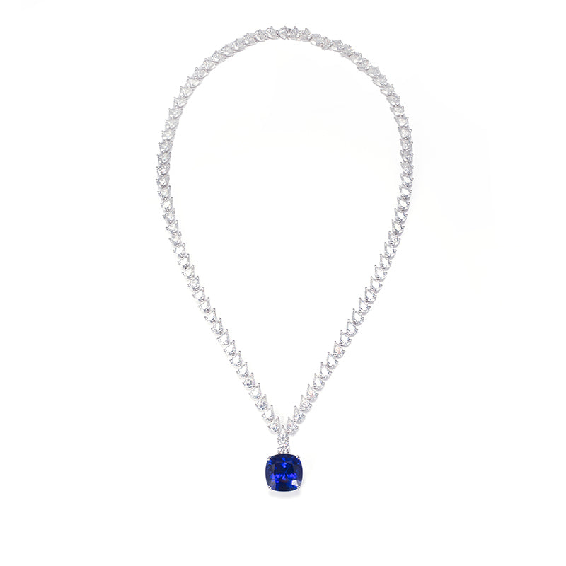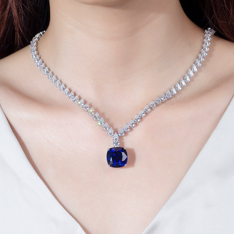 Indulge in sophistication with our stunning Moissanite Diamond Pear Cut and Lab-Grown Solitaire Sapphire Chain Necklace, Ring, and Earrings Set in Sterling Silver. This enchanting ensemble features a delicate chain adorned with dazzling pear-cut Moissanite diamonds, complemented by a solitary cushion-cut lab-grown sapphire on the necklace. Each piece is meticulously crafted to exude timeless elegance and charm. Elevate your style and celebrate special moments with this exquisite set, perfect for weddings, engagements, or any elegant affair.