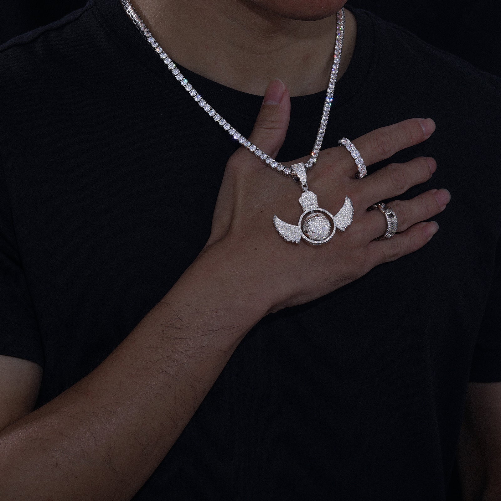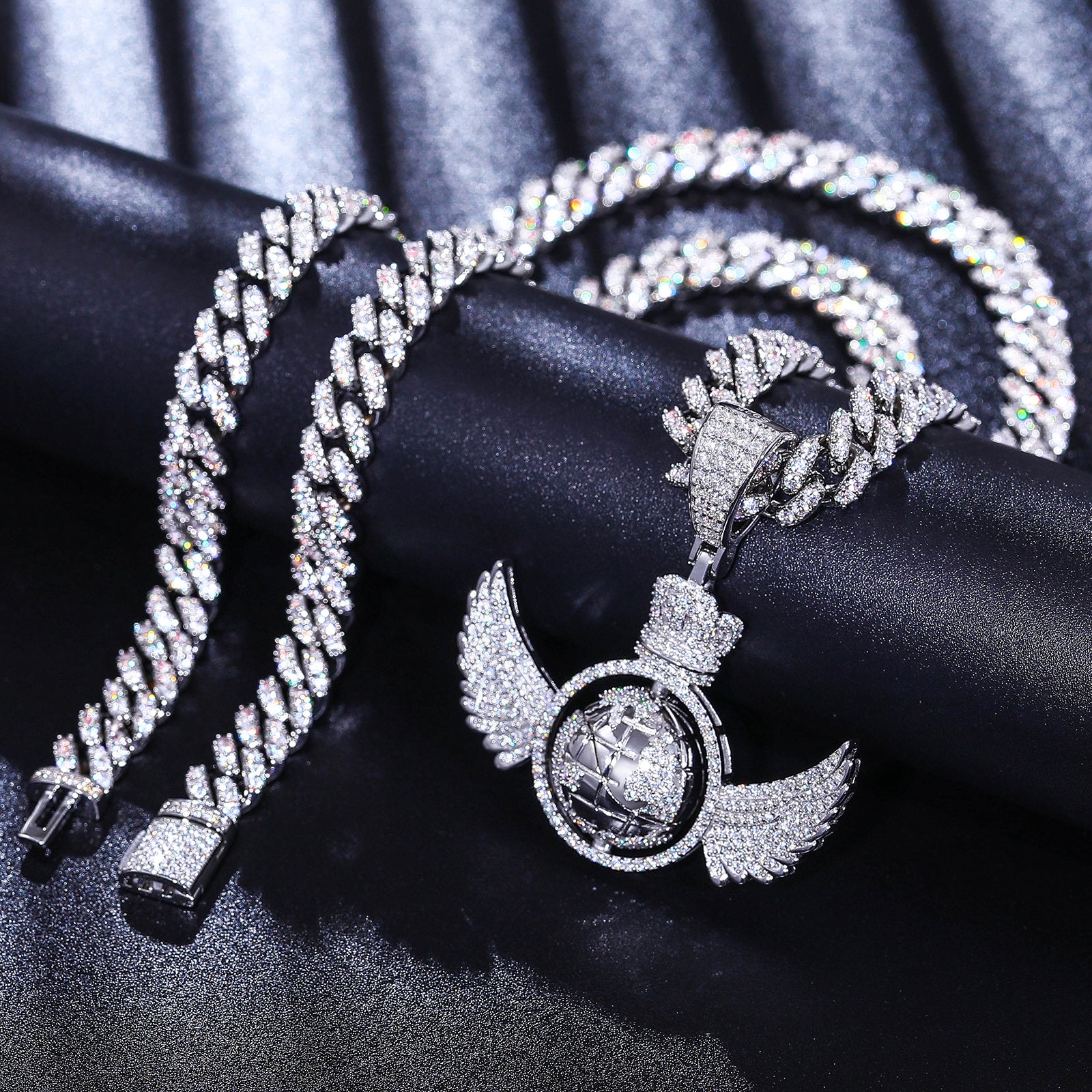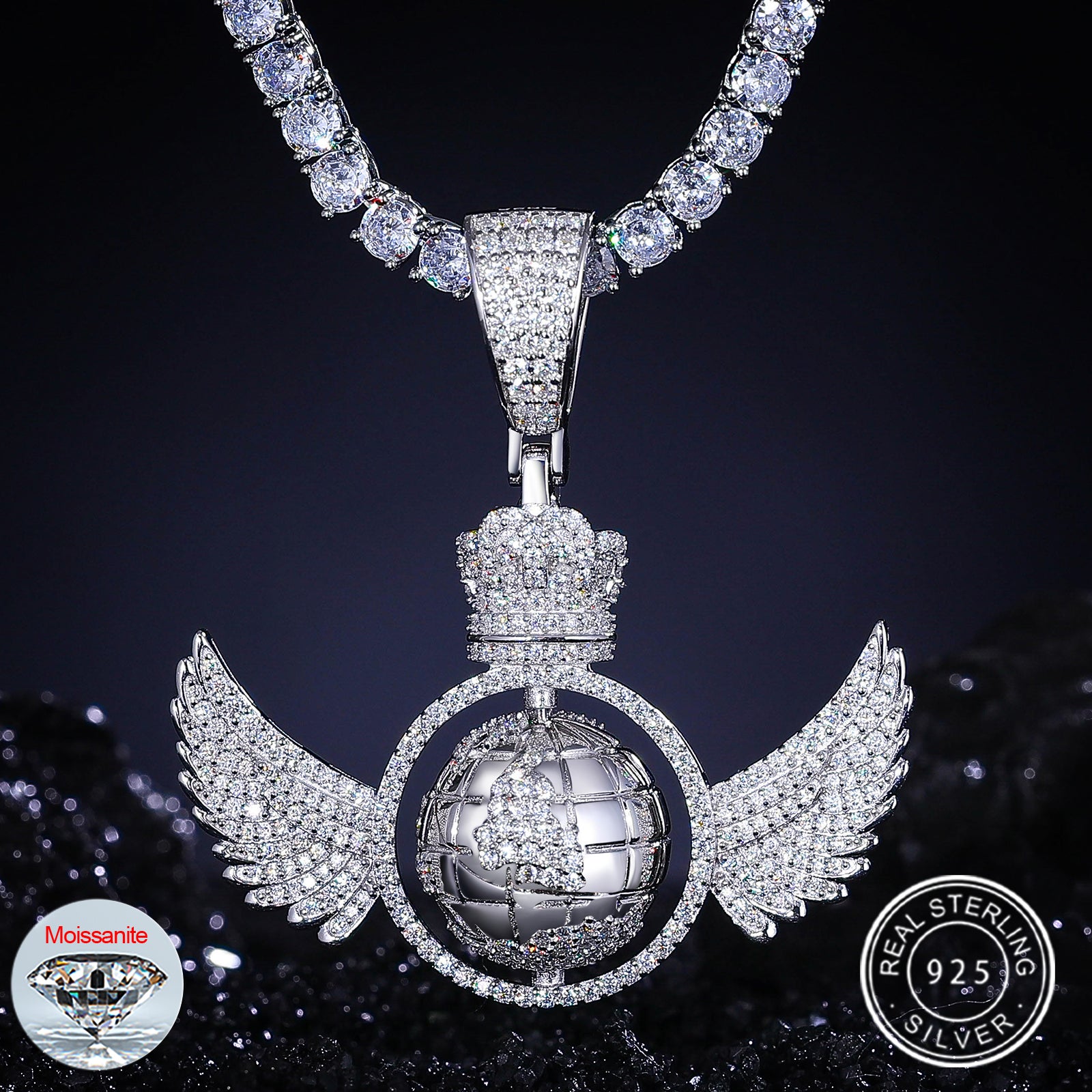 The Moissanite Diamond Rotating Globe Wing Pendant in Sterling Silver is a mesmerizing piece that combines movement and sparkle. Featuring a rotating globe encircled by delicate wings, this pendant showcases brilliant VVS Moissanite diamonds set in 925 Sterling Silver. Available in anti-tarnish white gold or 18K gold plating, it offers a luxurious shine that lasts. This unique design is perfect for those who love hip-hop and iced-out jewelry, adding a dynamic and stylish flair to any look. 🌍✨