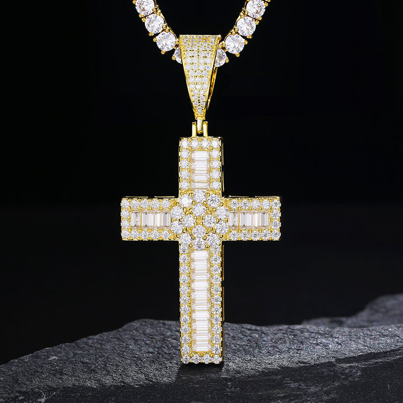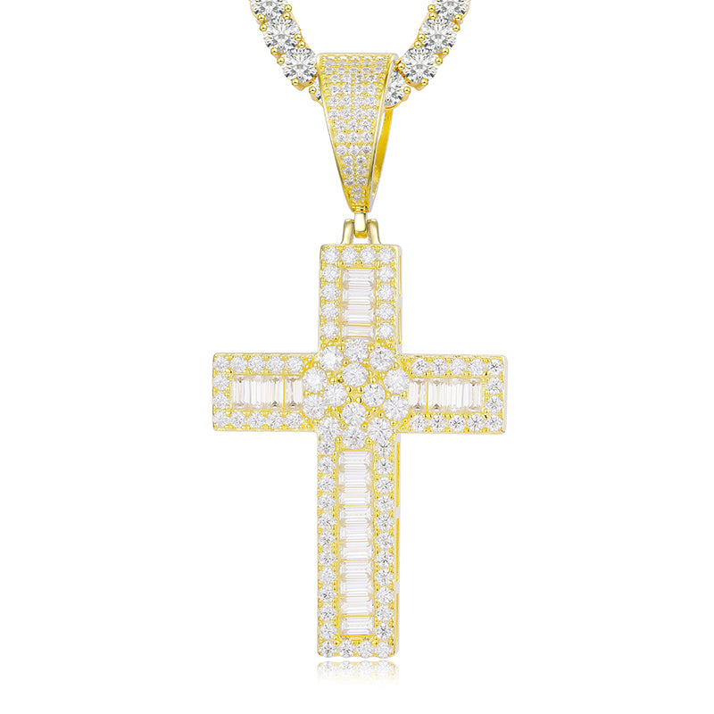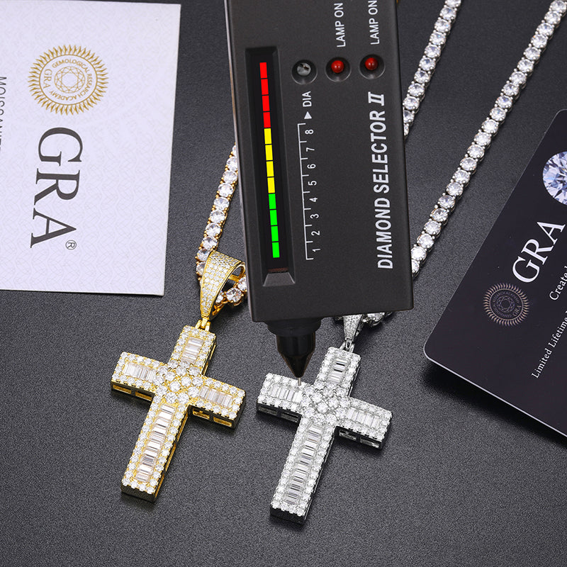 MOISSANITE DIAMOND ROUND-BAGUETTE CROSS PENDANT IN STERLING SILVER