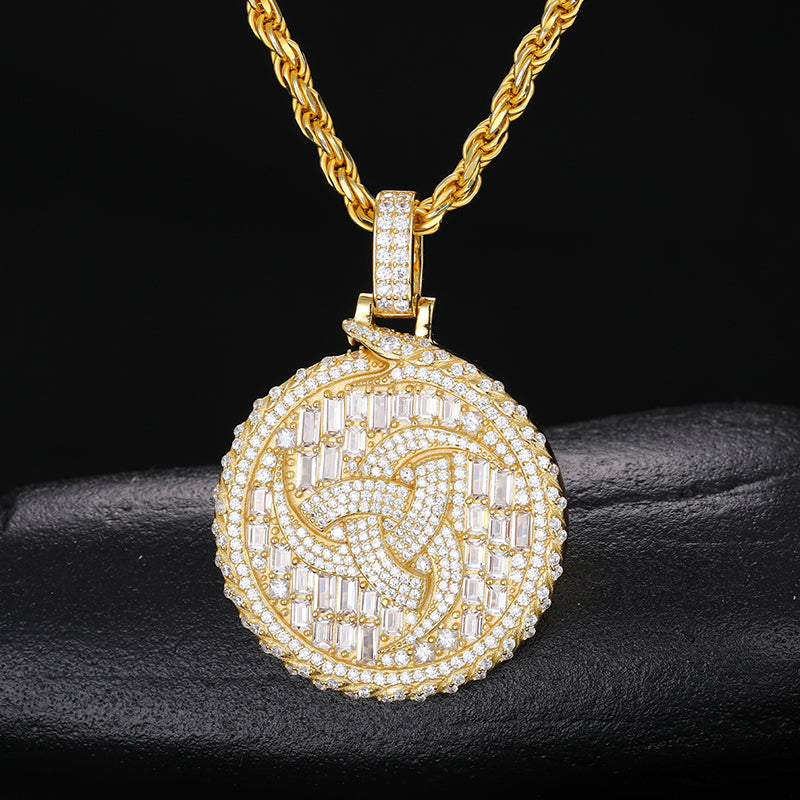 Introducing our captivating Moissanite Diamond Tourbillion Baguette Round Charm Coin Pendant in Sterling Silver. 💎 Elevate your style with this exquisite piece, featuring a captivating blend of baguette and round moissanite diamonds. ✨ Add a touch of sophistication to any ensemble and make a statement with this elegant pendant that exudes timeless charm and luxury.