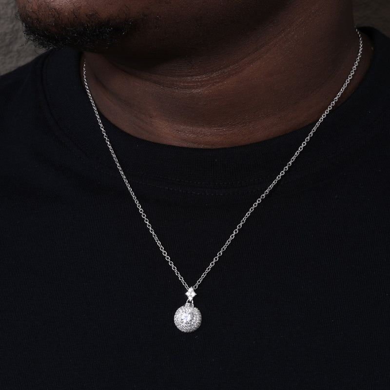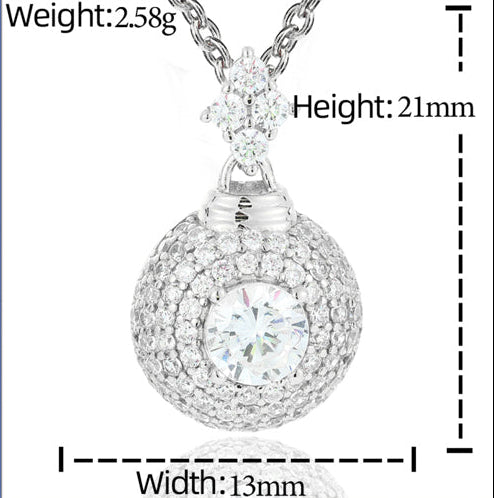 Moissanite Halo Sphere Pendant in Sterling Silver: Illuminate your neckline with the Moissanite Halo Sphere Pendant in Sterling Silver. Centered with a brilliant round-cut moissanite surrounded by a pavé-set halo that extends into a shimmering dome, this pendant radiates elegance from every angle. Crafted in high-polish 925 sterling silver, it blends timeless sophistication with modern sparkle—perfect for both refined evenings and everyday glamour. ✨