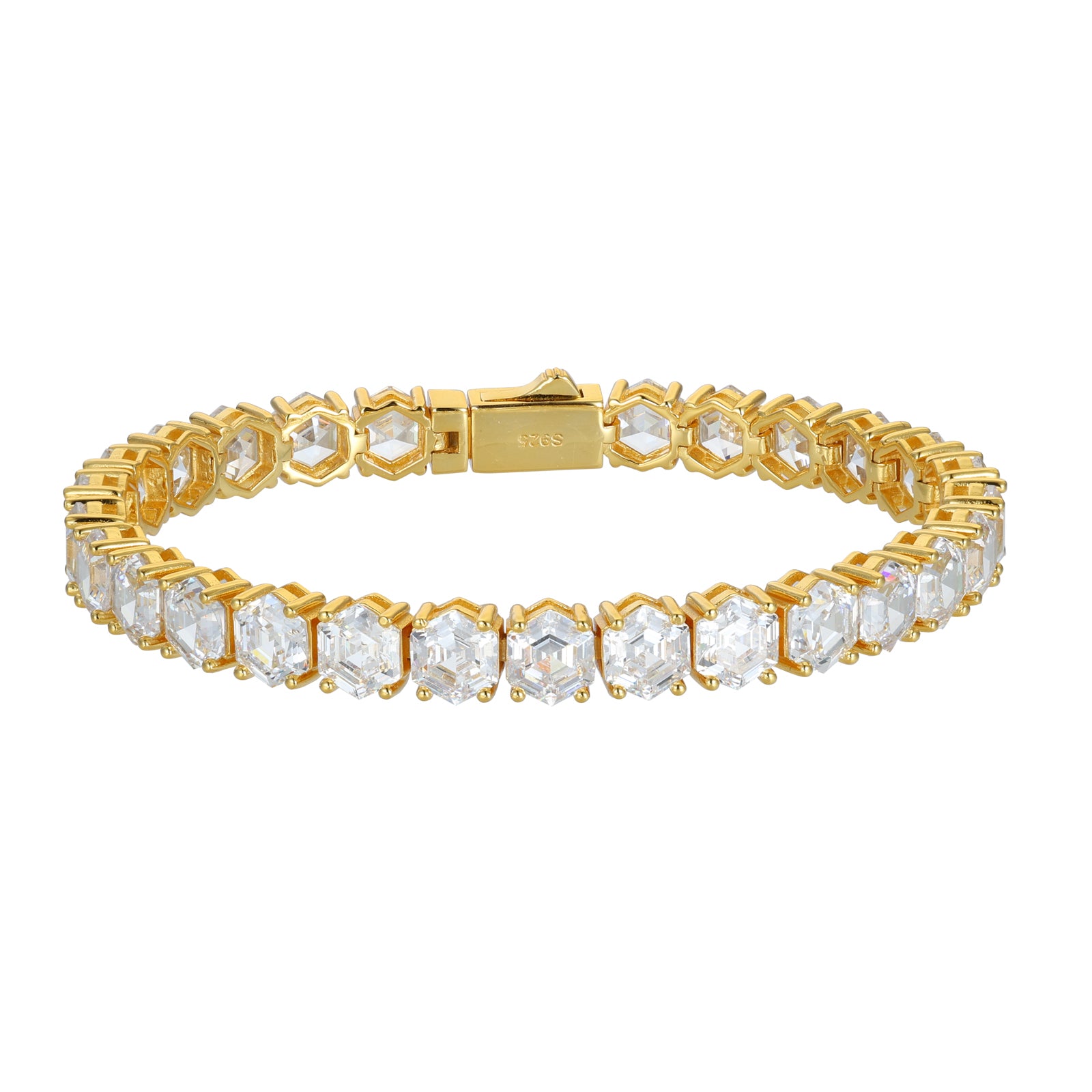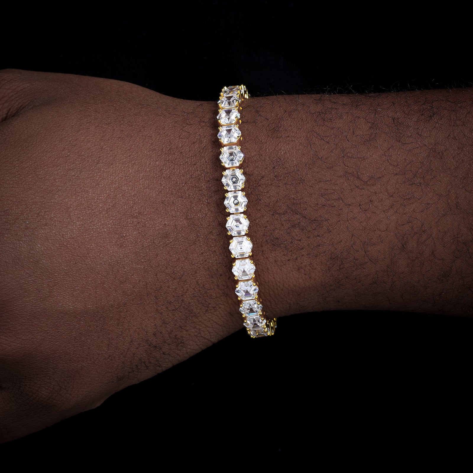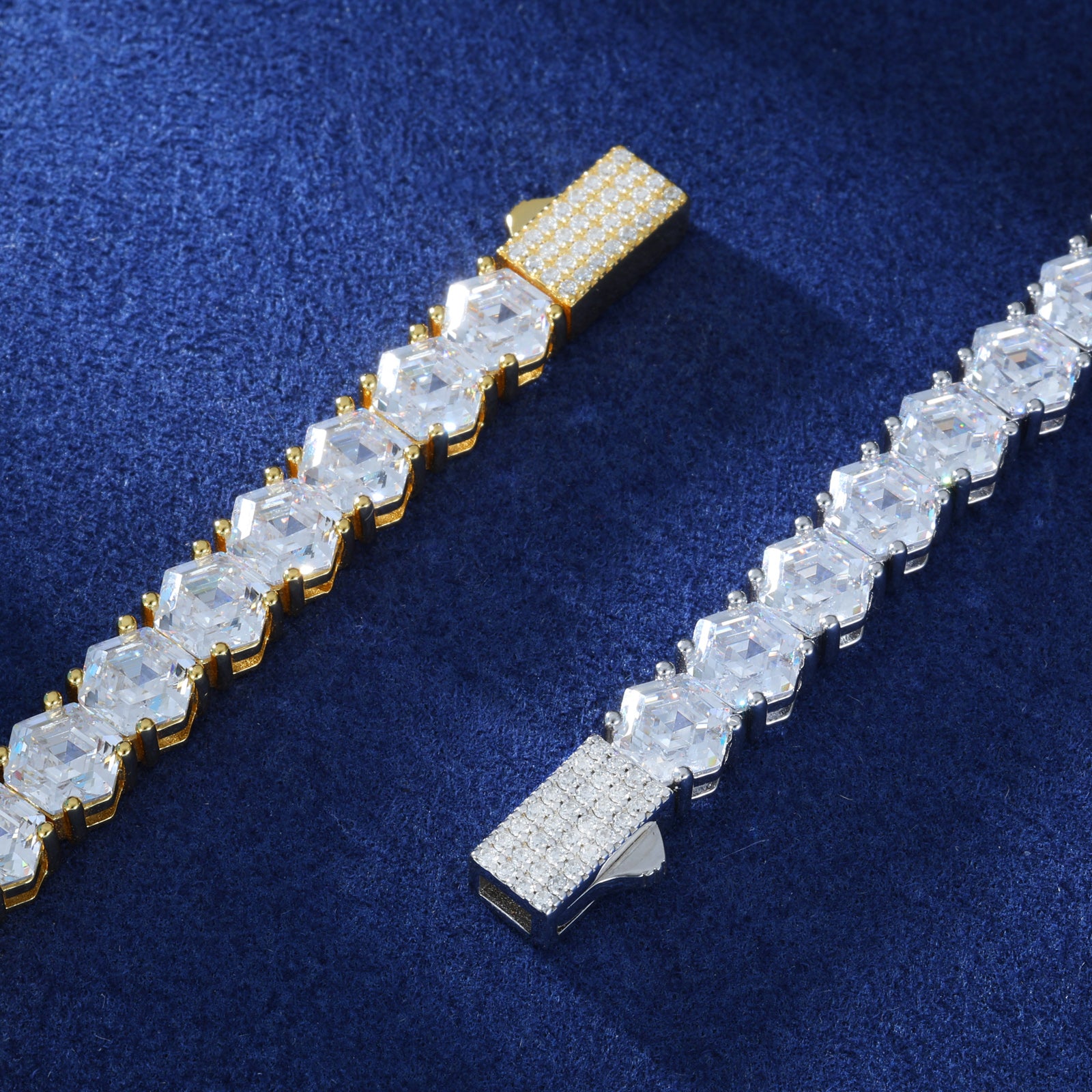 Moissanite Hexagonal Asscher Cut Tennis Bracelet: A fusion of geometric precision and timeless brilliance, this bracelet features mesmerizing hexagonal Asscher-cut moissanite stones. Set in sterling silver, it delivers unmatched sparkle and modern elegance for any occasion. ✨💎