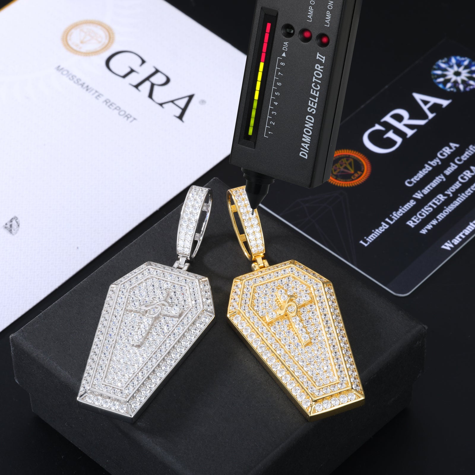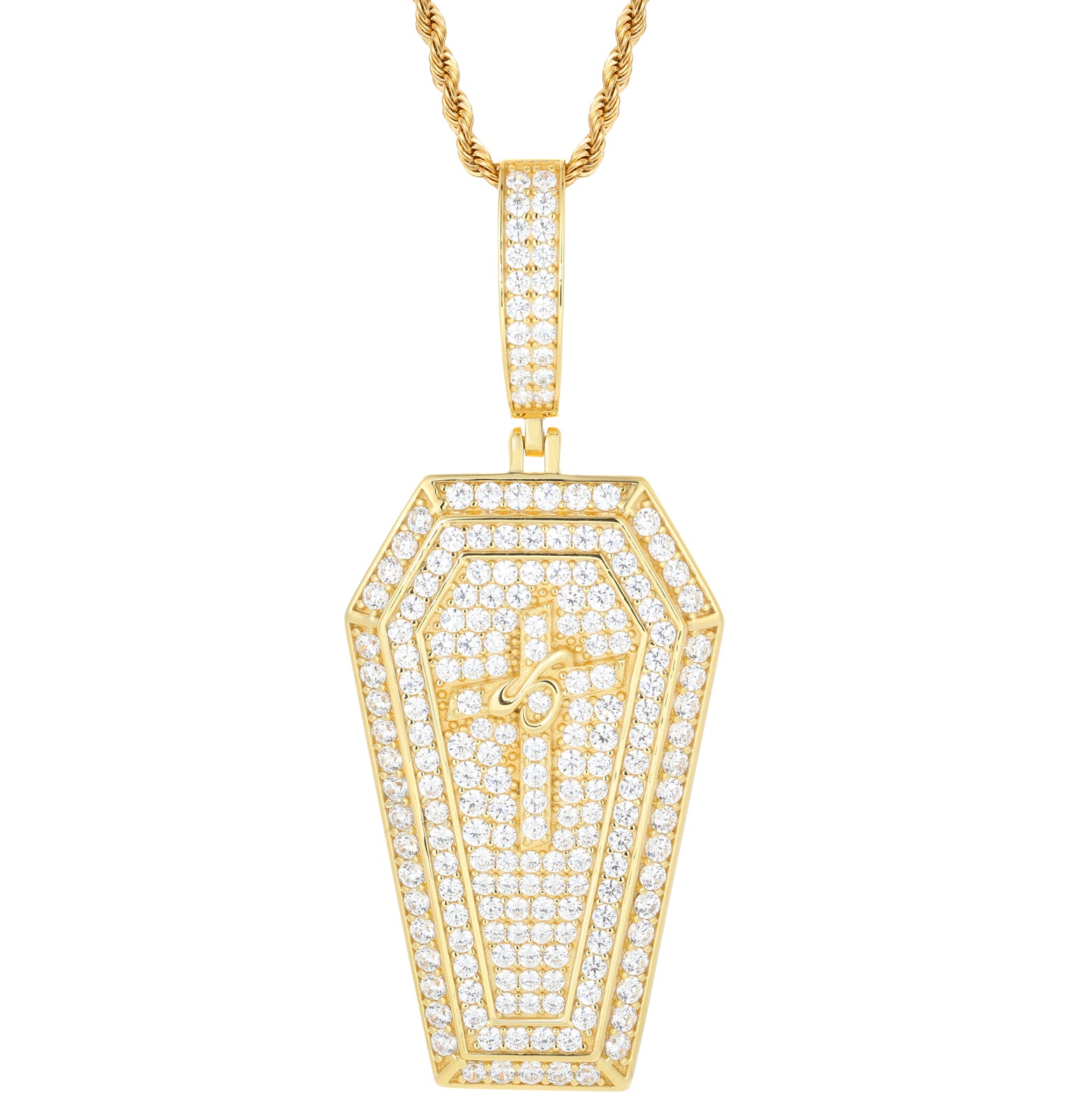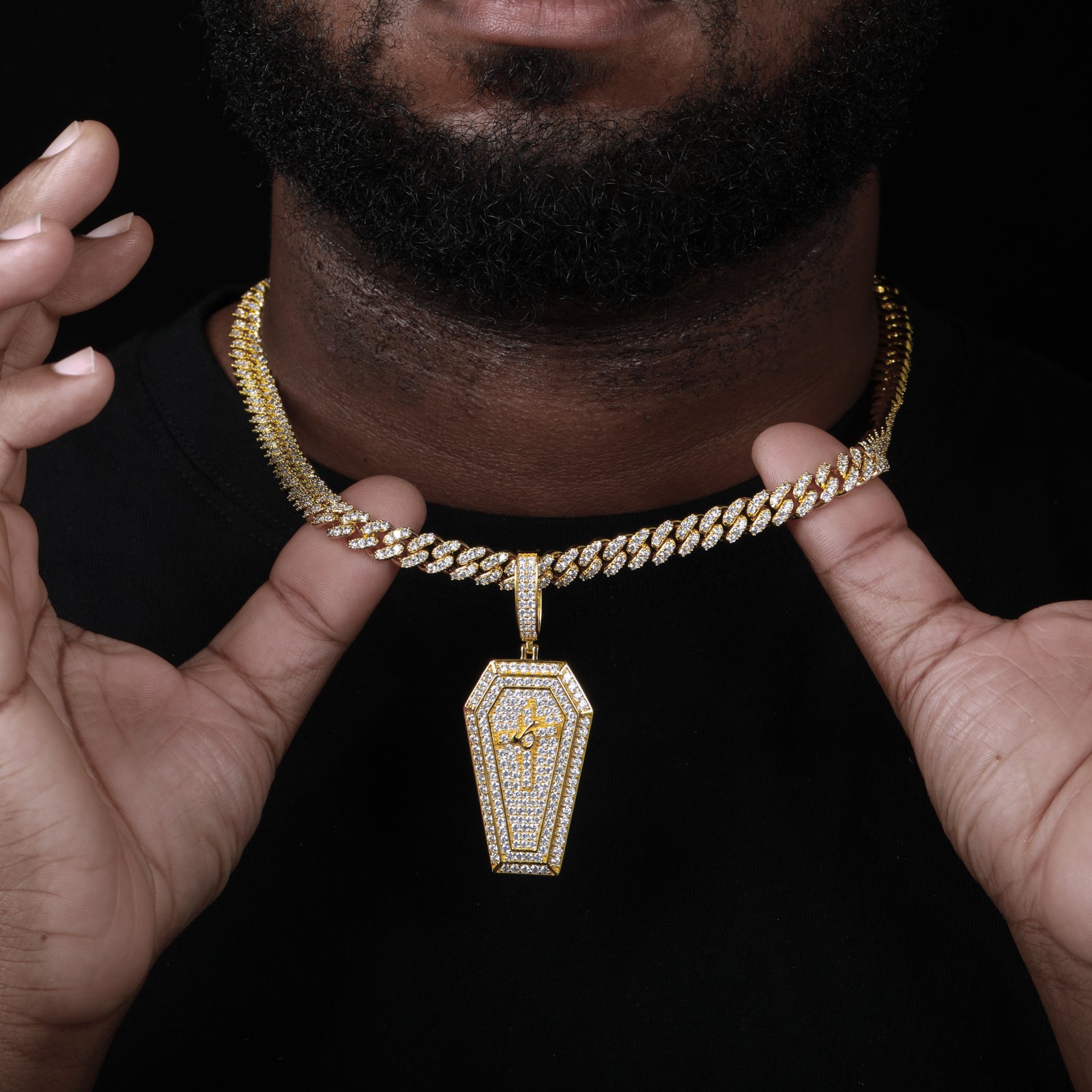 Moissanite Iced Out Coffin Cross Pendant in Sterling Silver: A bold fusion of gothic and luxury, this pendant features a striking coffin-shaped cross fully encrusted with dazzling moissanite stones. Crafted in sterling silver, its intricate detailing and iced-out brilliance make it a standout piece for those who embrace edgy elegance. Perfect for statement styling with a symbolic touch. ⚰️✨