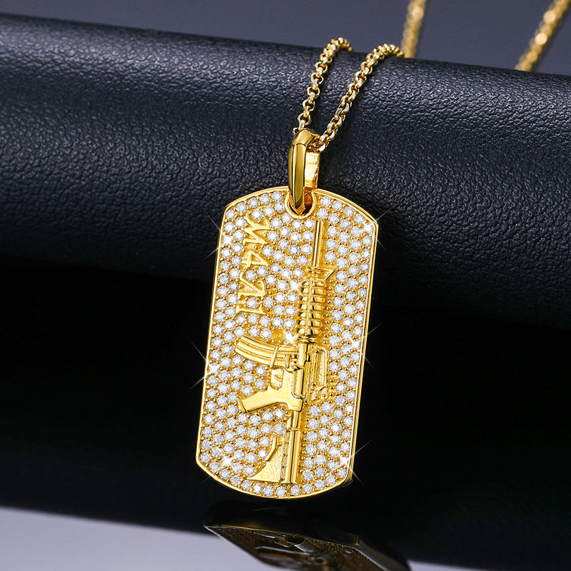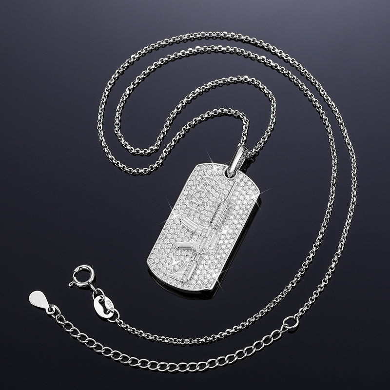 Introducing our Moissanite Rifle Pendant Necklace in Sterling Silver. This bold necklace features an intricately designed rifle pendant, adorned with sparkling moissanite stones. Crafted in high-quality sterling silver, it combines rugged style with refined elegance. Perfect for those who appreciate unique and eye-catching jewelry, this necklace adds a touch of daring sophistication to any outfit. Ideal for everyday wear or special occasions, it is designed to captivate and inspire. 🔫💎✨