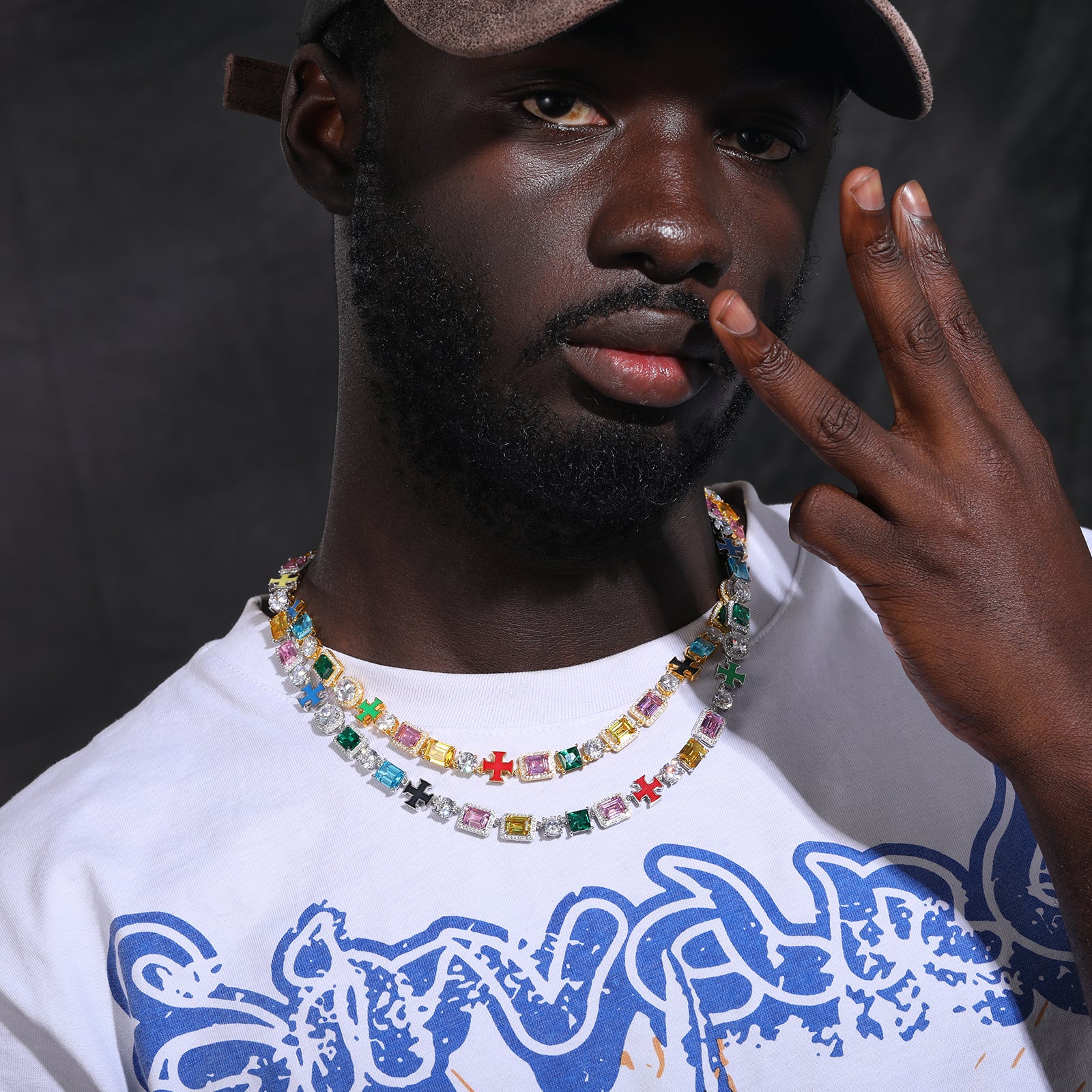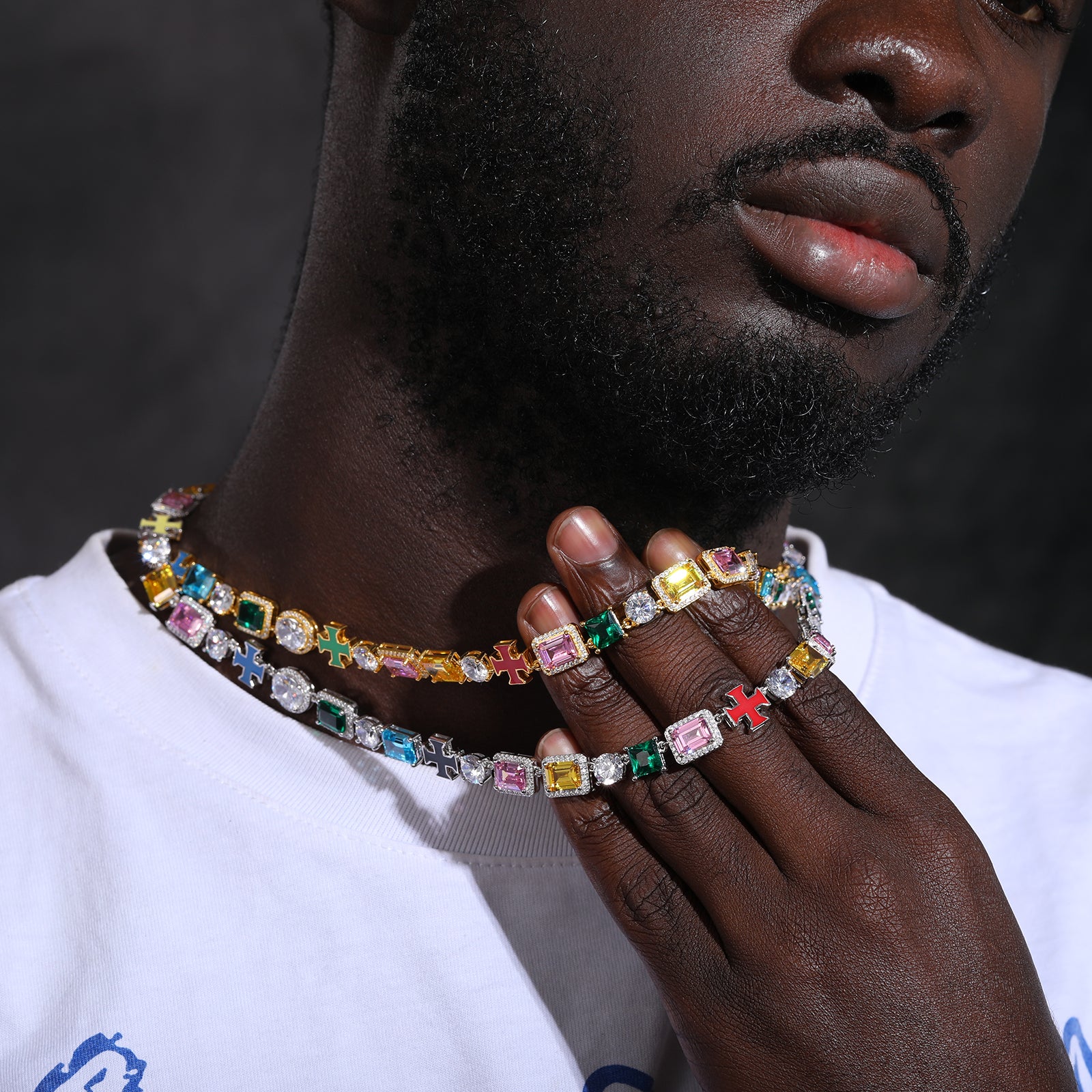 Elevate your style with the Tennis Link Chain Necklace with Mix Gemstones in sterling silver. This luxurious piece features a row of vibrant Colorful Zircon set along a sleek tennis link design. Adding a unique touch, the enamel-plated cross charm enhances the overall elegance, creating a beautiful contrast with the sparkling stones. Perfect for layering or wearing alone, this necklace or bracelet brings a bold pop of color and sophistication to any look. 💎🌈