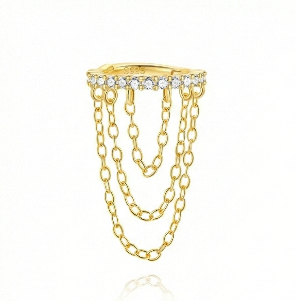 CHAIN TASSEL EAR CUFF IN STERLING SILVER: This statement ear cuff features cascading chain tassels that create fluid movement and a bold, modern look—no piercing required. Crafted in solid 925 sterling silver, it offers a smooth, polished finish with a secure, comfortable fit. Lightweight yet eye-catching, it’s perfect for everyday styling or elevating evening outfits. Ideal for those searching for sterling silver ear cuffs, chain tassel earrings, or contemporary ear jewelry.