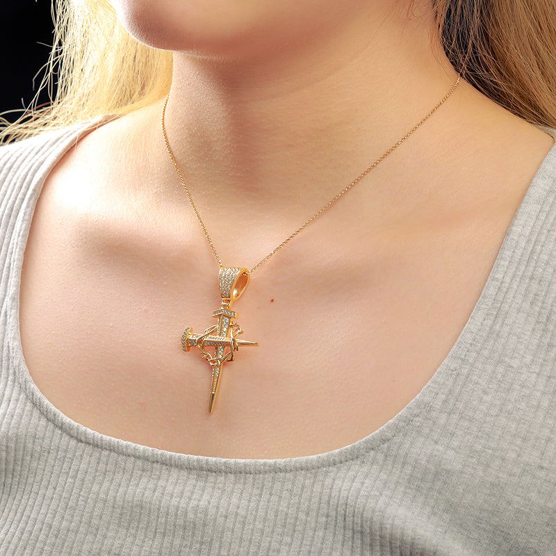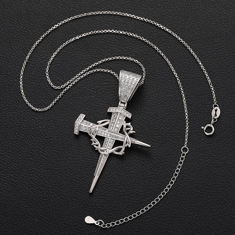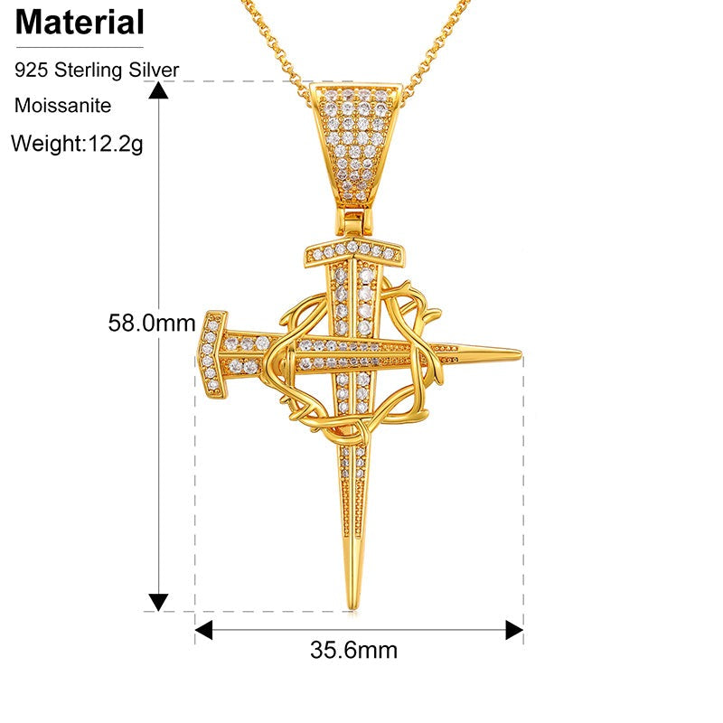 The Moissanite Nail Inset Circular Cross Pendant Necklace in Sterling Silver is a distinctive and stylish piece. Featuring a circular design with a cross inset with nails, this pendant is crafted from high-quality sterling silver and VVS D Color Moissanite Diamonds. Its unique design and fine craftsmanship make it a perfect accessory for those who appreciate both contemporary and classic styles.