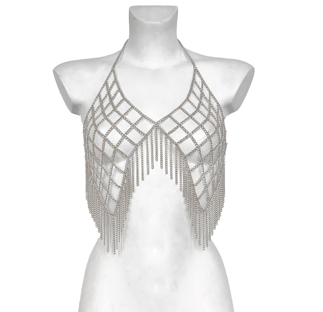 NET FRINGE BODY CHAIN BRALETTE: A statement body chain bralette designed with an intricate net-style chain structure and fluid fringe detailing that drapes naturally over the body. Crafted to sit comfortably while adding bold shine and movement, it elevates swimwear, festival looks, and evening outfits alike. Lightweight yet striking, this piece is made to layer or wear solo for a confident, fashion-forward edge ✨🔥