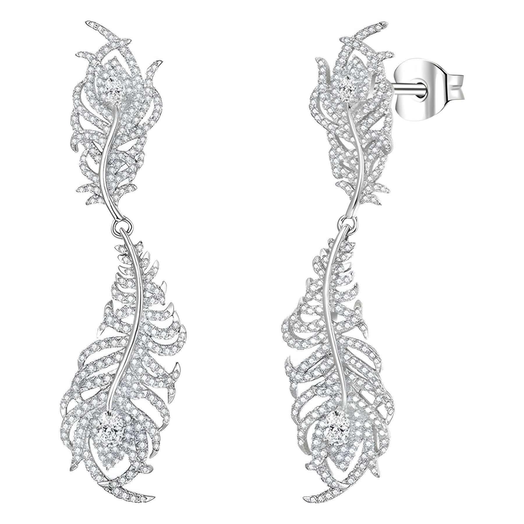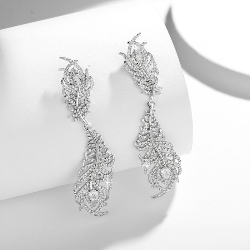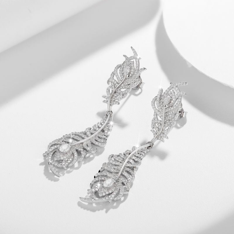 PEACOCK FEATHER MOISSANITE DROP EARRINGS IN STERLING SILVER