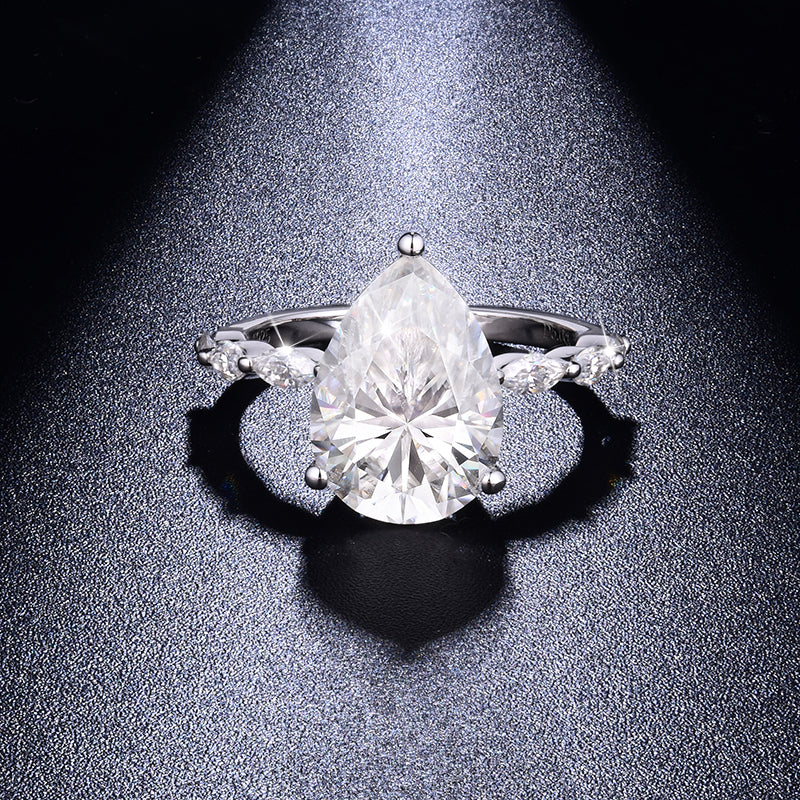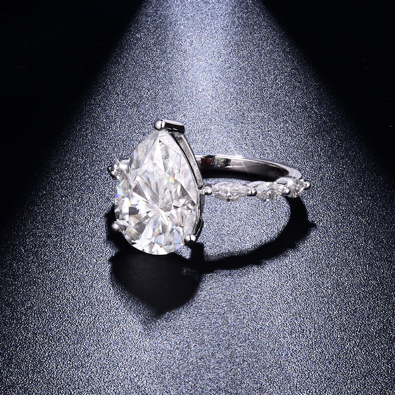 Pear Cut Moissanite Engagement Ring in Sterling Silver: Elegant and eye-catching, this ring features a brilliant pear-cut moissanite that sparkles with timeless beauty. The polished sterling silver band is accented with additional stones, enhancing its brilliance and sophistication. A perfect balance of classic charm and modern elegance, this engagement ring symbolizes love that shines forever 💍✨.