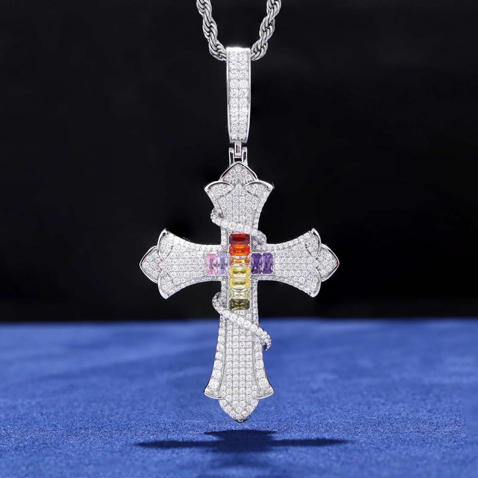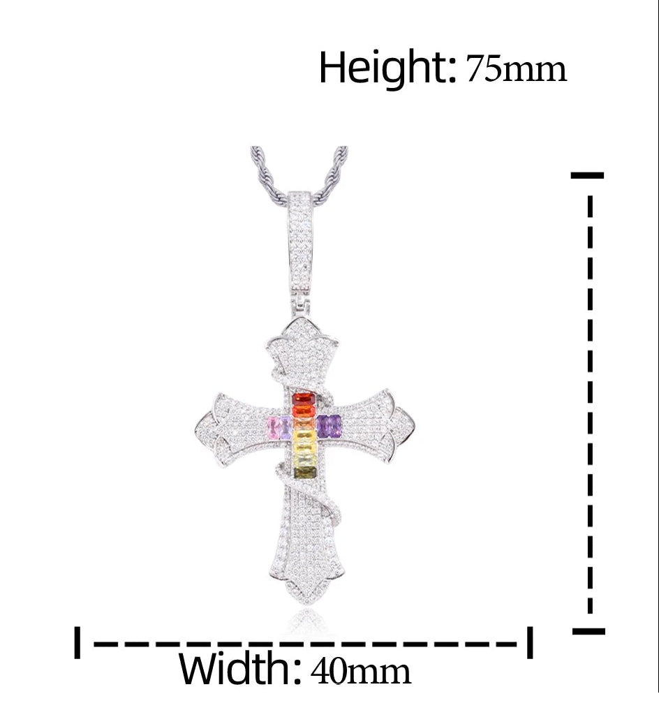 Serpent of Salvation Multicolor CZ Moissanite Cross Pendant in Sterling Silver: A powerful fusion of symbolism and craftsmanship, the Serpent of Salvation Cross Pendant reimagines the classic cross through a bold, modern lens. Sculpted in solid 925 sterling silver, the pendant features a pavé-set cross form encircled by a finely detailed serpent—an ancient symbol of wisdom, transformation, and redemption.