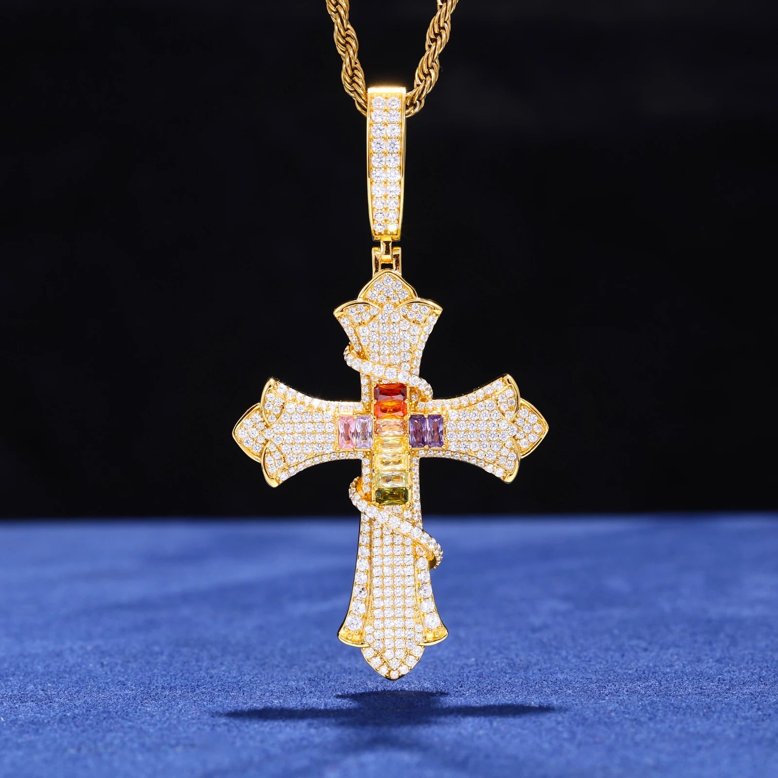 SERPENT OF SALVATION MULTICOLOR CZ MOISSANITE CROSS PENDANT IN STERLING SILVER