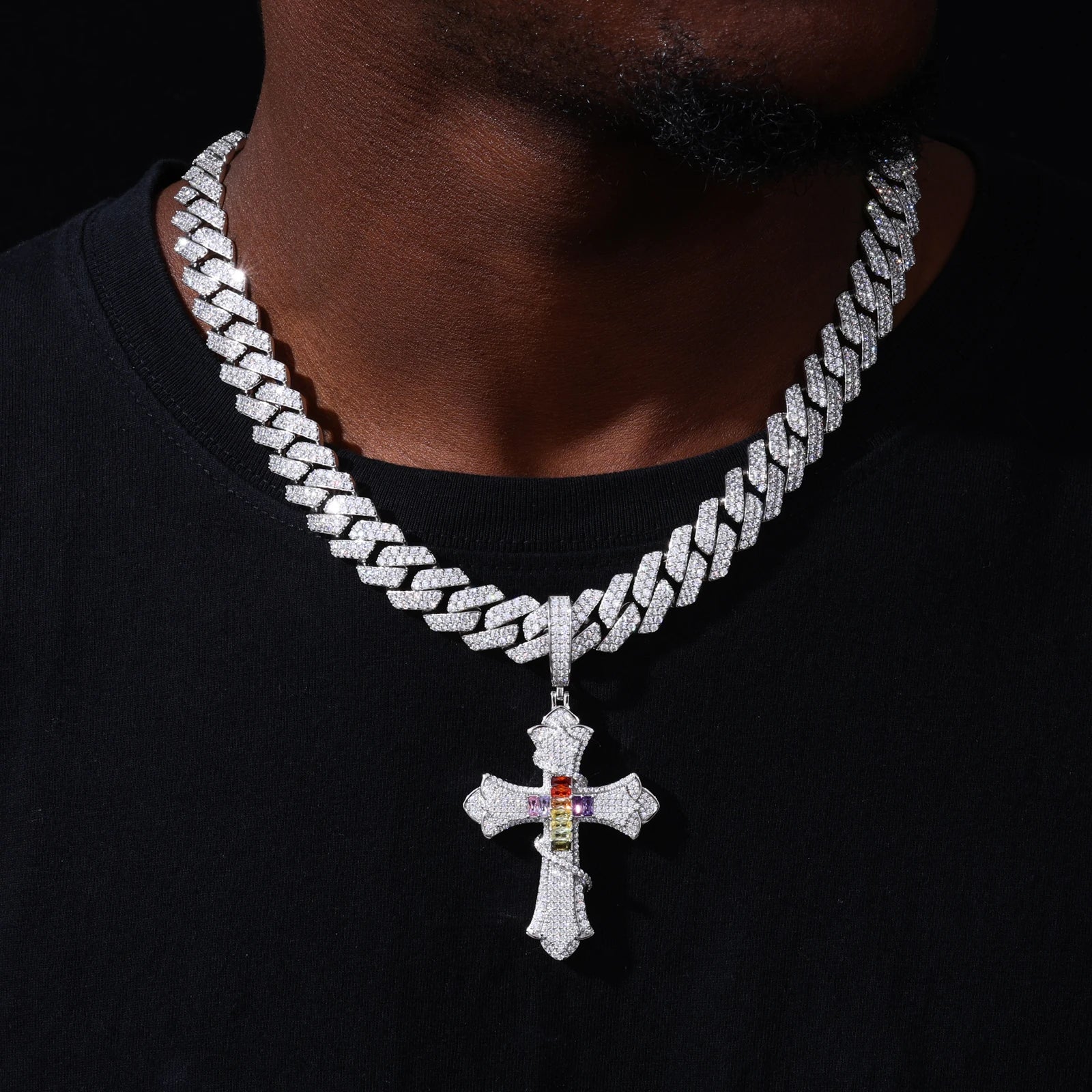 At the center, a vertical arrangement of multicolor CZ moissanite stones introduces a striking spectrum of color, representing balance, renewal, and spiritual energy. Each stone is precision-set to enhance brilliance and depth, while the surrounding white pavé delivers an intense, diamond-like shimmer from every angle. The fully iced bail ensures a seamless, elevated look when paired with both rope and Cuban chains.