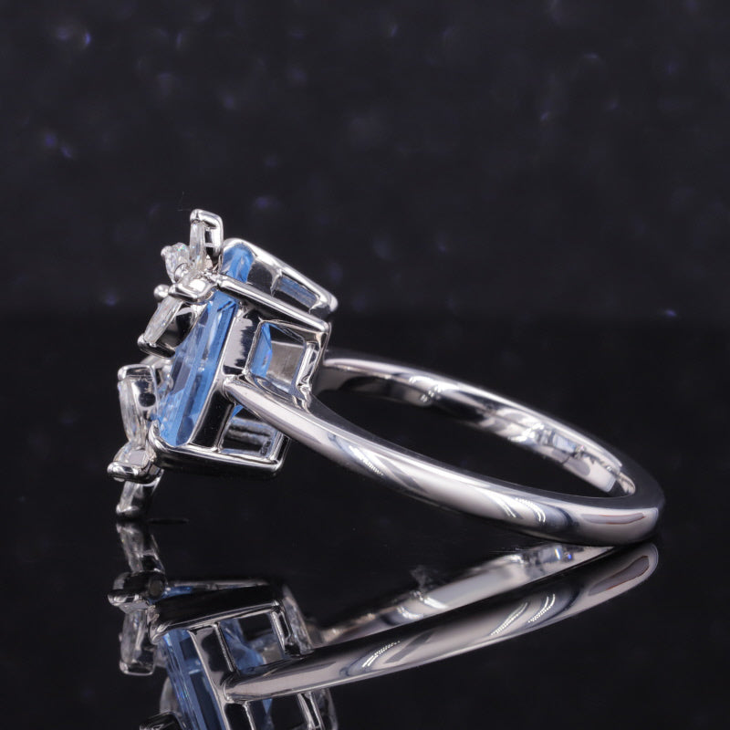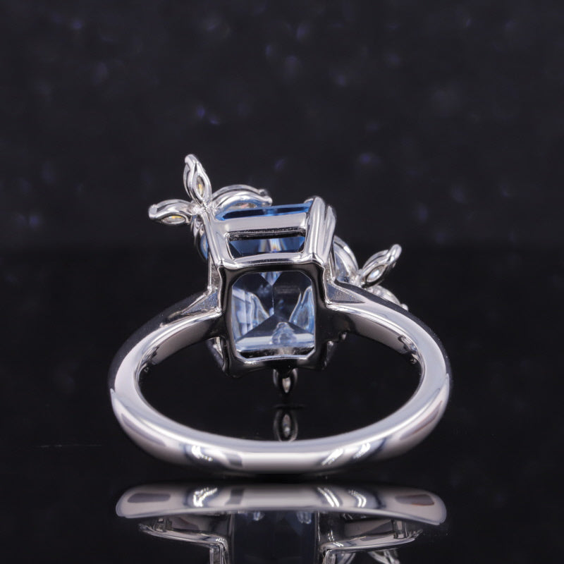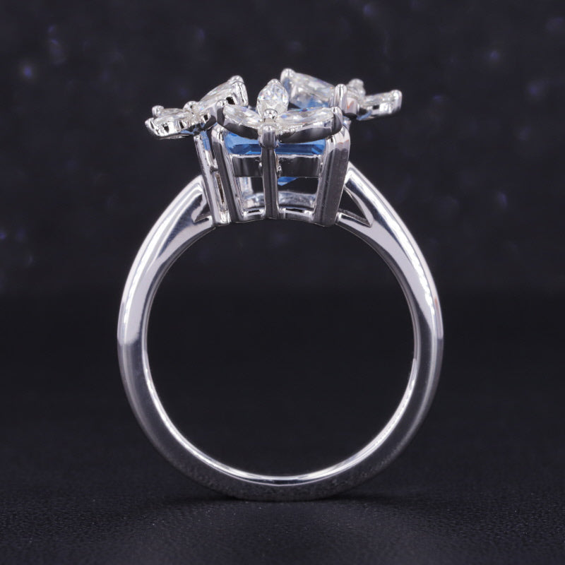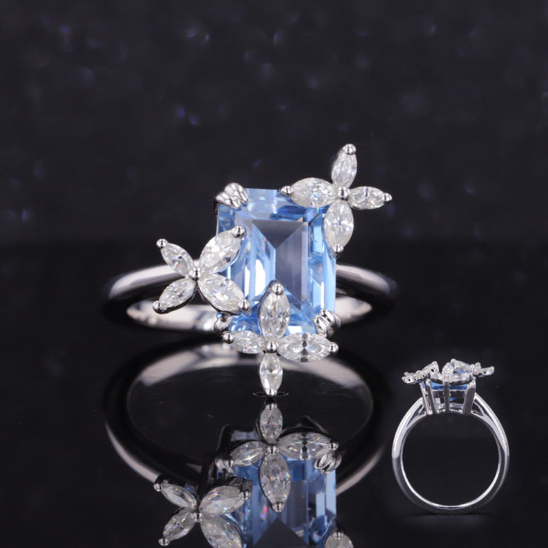 This exquisite ring features a unique design with three flower clusters of dazzling moissanite stones and a baguette-cut lab-grown sapphire. Crafted in 14K solid white gold, this piece showcases a blend of elegance and modern style, making it perfect for any special occasion.