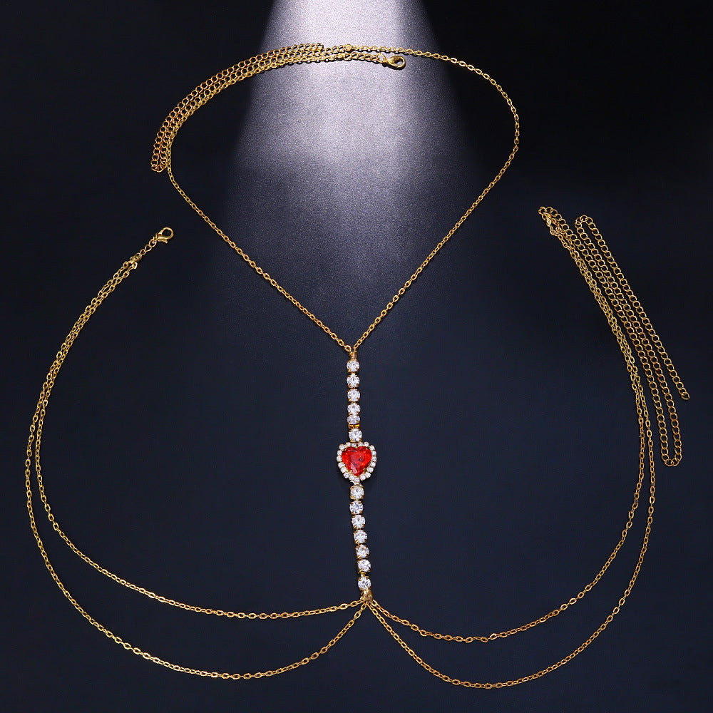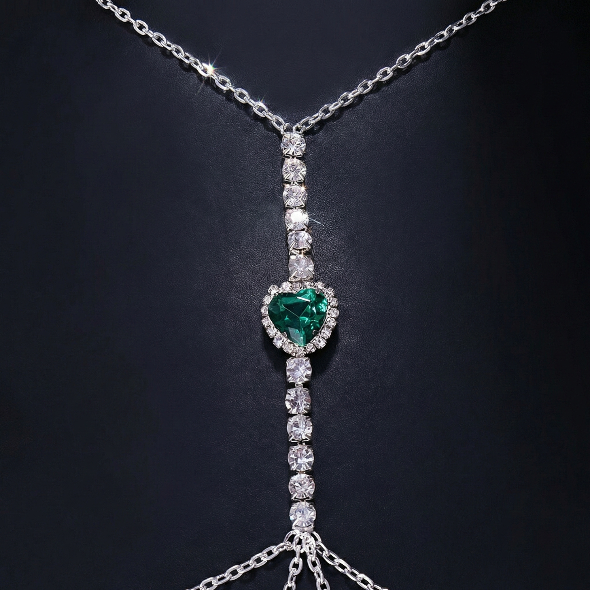 VALORA HEART HARNESS BODY CHAIN: Designed to drape effortlessly along the neckline and body, this statement piece features a sleek vertical line of shimmering stones finished with a bold heart centerpiece. Delicate chain detailing wraps gracefully around the waist, creating a sculpted, flattering silhouette. Perfect for deep-neck outfits, resort wear, or evening looks, it adds just the right balance of elegance and edge ✨💎