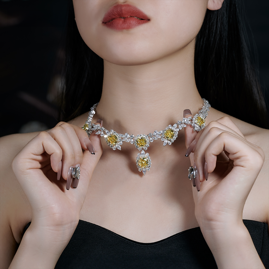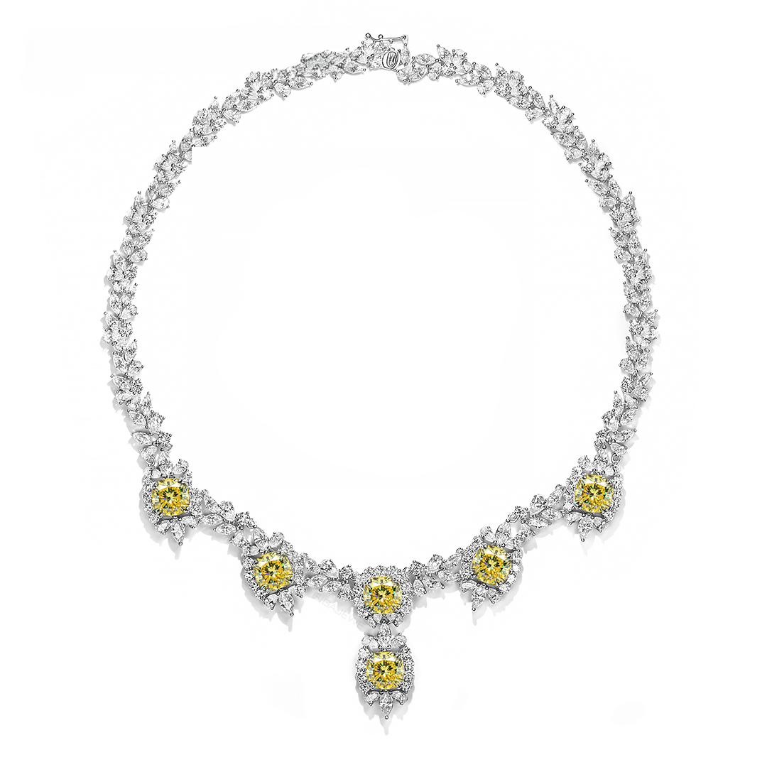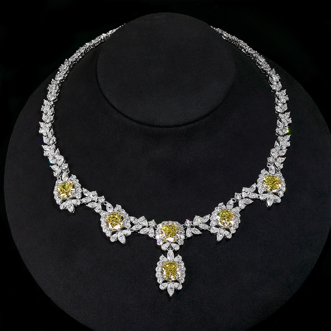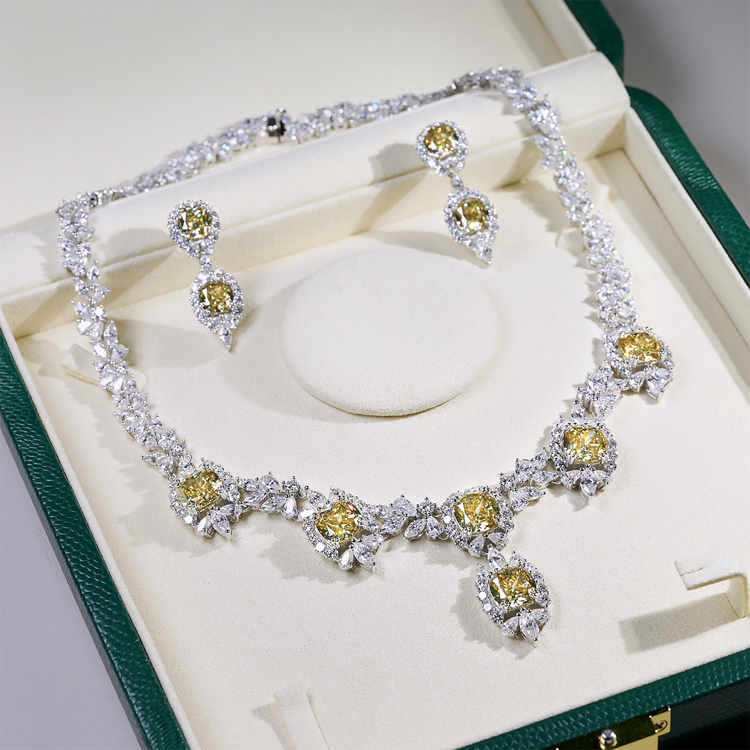The Yellow Cushion Cut Moissanite Necklace in Solid Gold or Sterling Silver: This elegant necklace showcases Pendeloque cut which is unique and rare in itself, as it is a blend of Pear and Cushion Cut Moissanite stones, creating a breathtaking shimmer. Designed in a sophisticated blend of white gold and sterling silver, this 28-inch necklace captures timeless luxury and modern beauty. An exquisite piece for any occasion, the graceful sparkle of moissanite enhances the elegance of this fine necklace. 💎✨